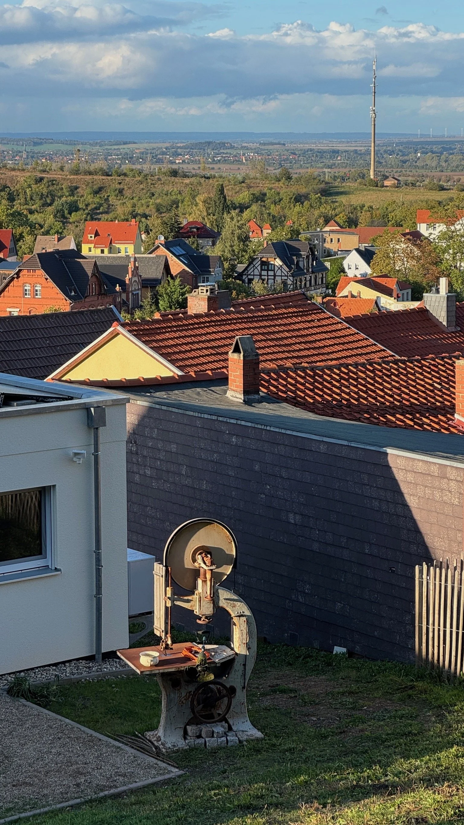 Über die große Schiebetür gelangen Sie in Frohweins nach Süden ausgerichtet Garten, der zum Waldrand hin aufsteigt. Eine große Terrasse mit Gartenmöbeln und Außenlicht erwartet sie in den warmen Monaten. Die malerische alten Säge dient als Stehtisch. Sonnenschirm, Liegestuhl und Elektro-Grill warten im Gartenschuppen auf Sie und lassen absolute Urlaubsatmosphäre entstehen. Weiterhin können Sie auf einer zweiten Terrasse mit Feuerschale und Bank die Abende ausklingen oder auf der oberen Aussichtsbank mit Blick auf Quedlinburg die Seele baumeln lassen. Der neu angelegte Garten ist noch im Einwachsen und wird immer schöner. Über das Gartentor gelangen Sie direkt an den Waldrand, dort erwartet ein Spielplatz ihre Kinder oder Sie starten direkt auf Wanderungen, Radtouren oder einen Spaziergang zum nahegelegenen Waldbad "Osterteich".